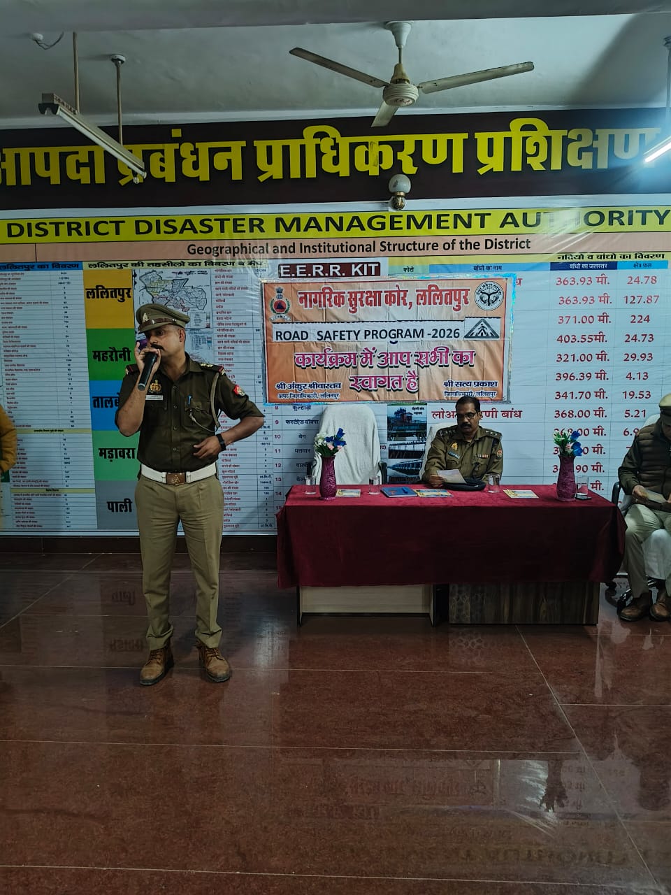 ललितपुर। उत्तर प्रदेश के ललितपुर में राष्ट्रीय सड़क सुरक्षा माह के अवसर पर पुलिस अधीक्षक, जनपद ललितपुर मो0 मुश्ताक के निर्देशन एवं अपर पुलिस अधीक्षक श्री कालू सिंह व क्षेत्राधिकारी यातायात राजेश श्रीवास्तव के पर्यवेक्षण में यातायात पुलिस ललितपुर द्वारा कलेक्ट्रेट में आपदा मित्रों एवं सिविल डिफेंस के सदस्यों को यातायात का प्रशिक्षण दिया गया तथा यातायात नियमों के प्रति जागरूक किया गया।